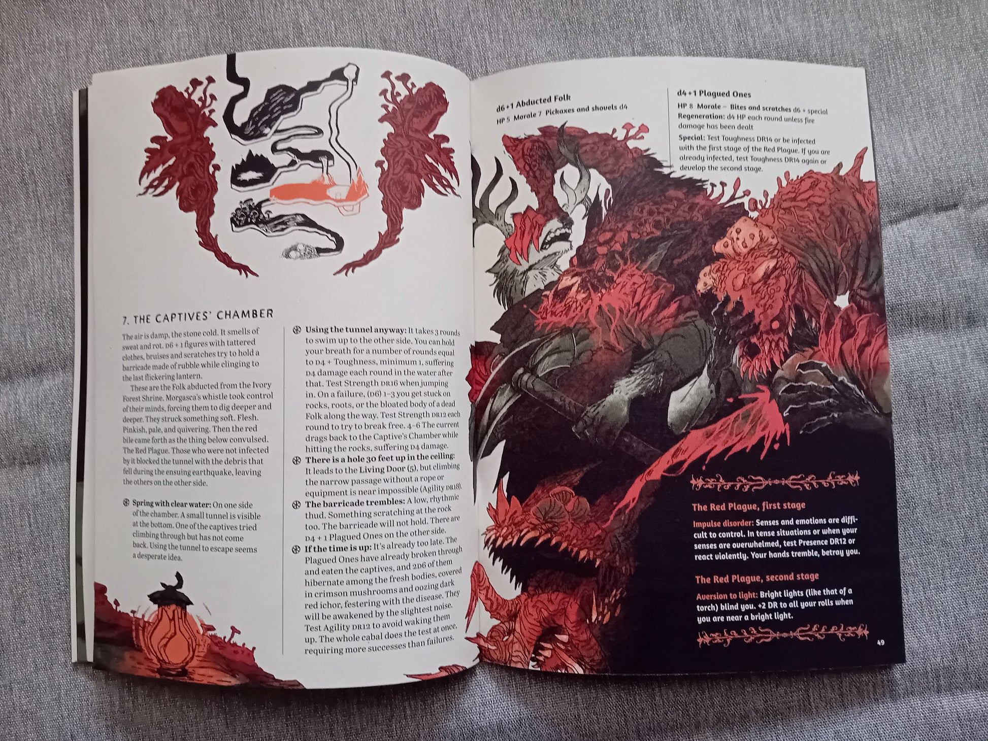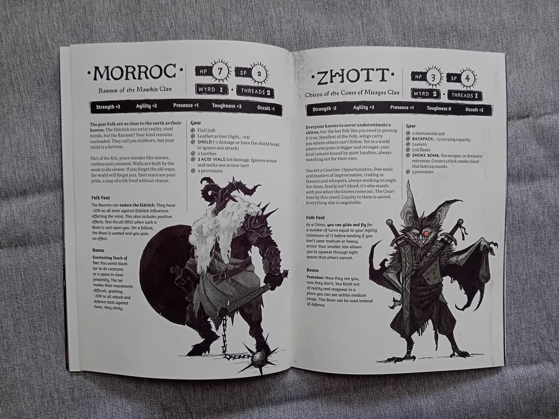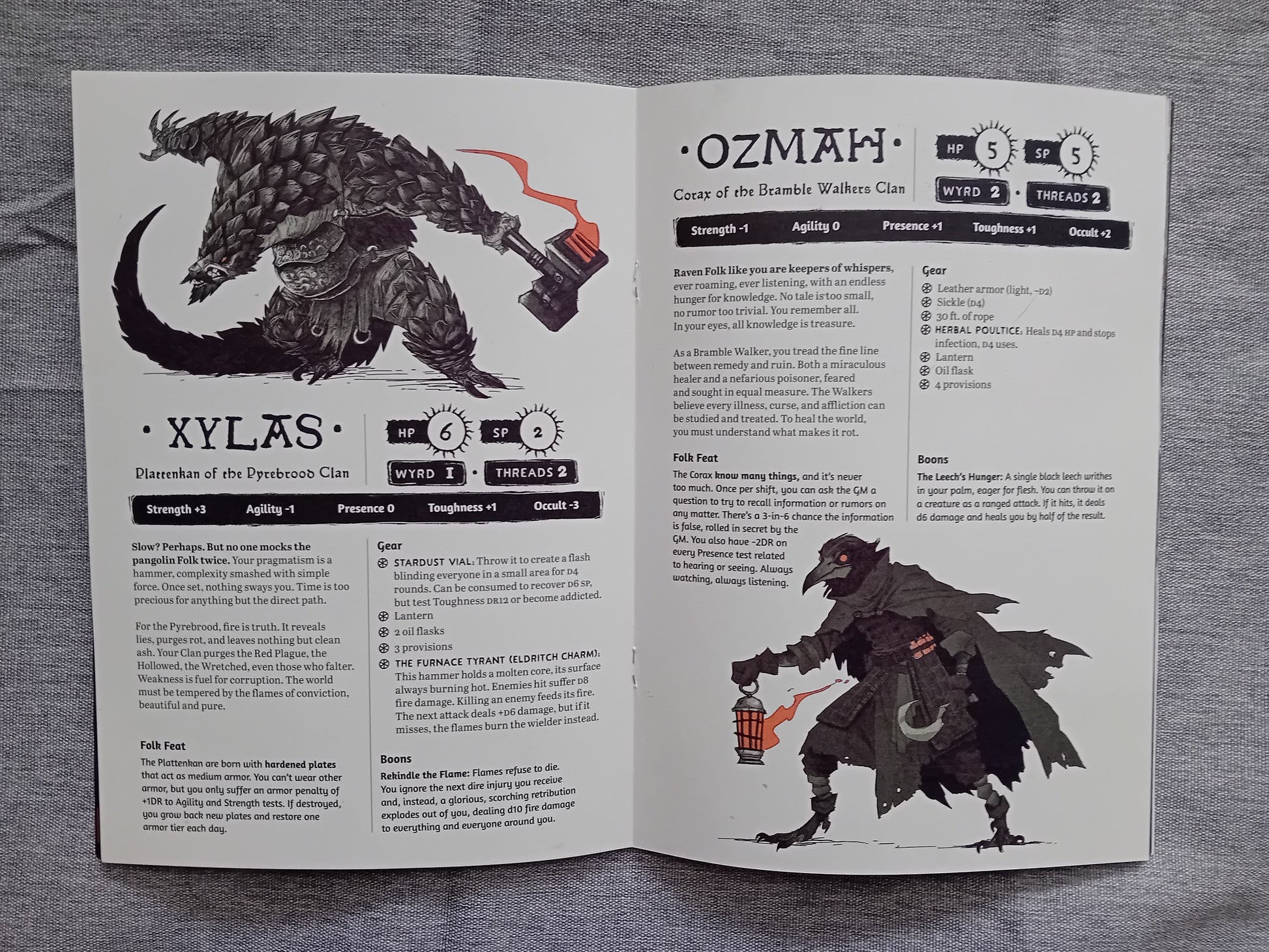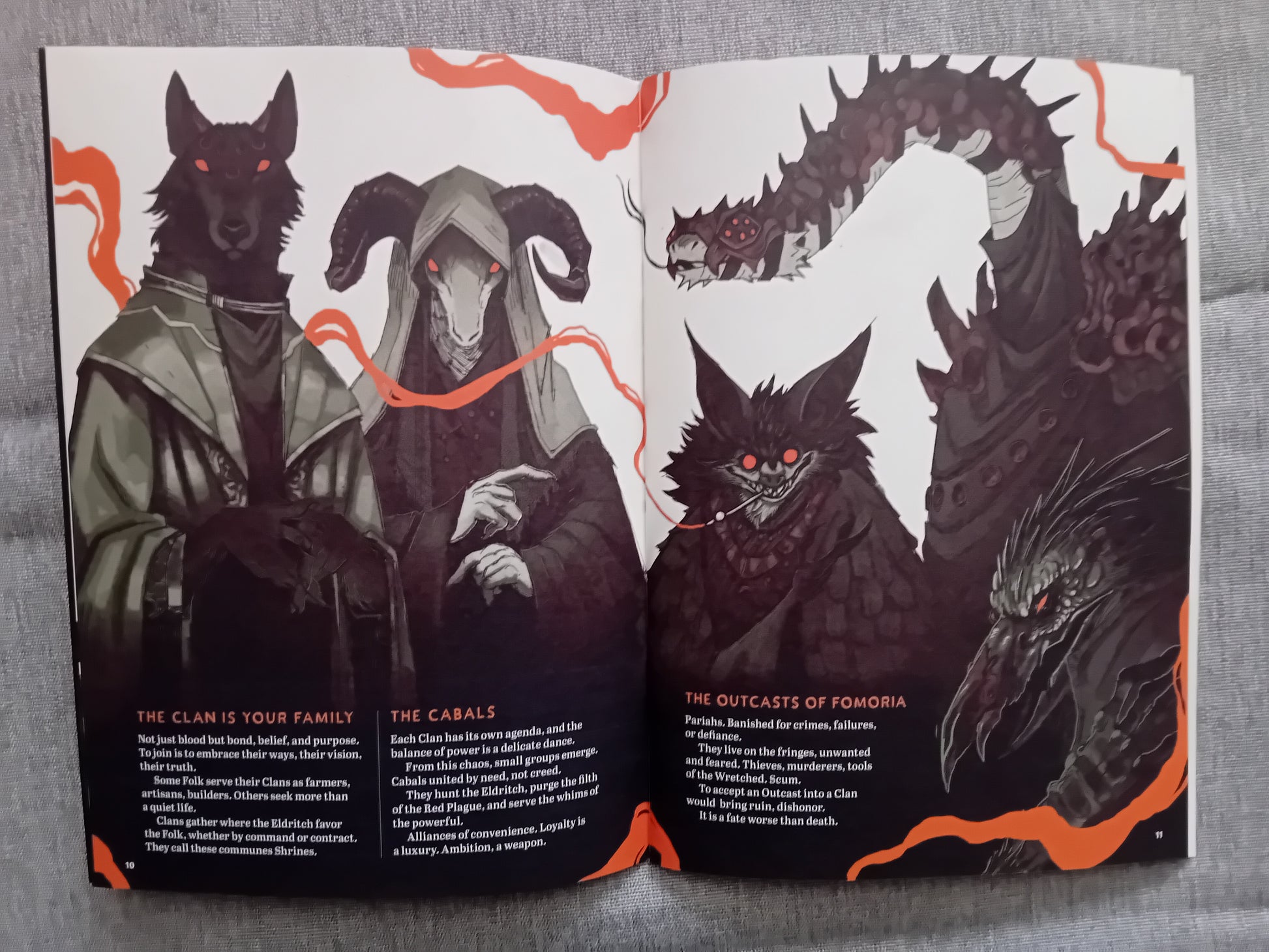 Player characters are united in a cabal, a small group drawn from different clans, bound together by duty or necessity. You hunt the Eldritch, purge the Red Plague, face the horrors of the insidious Darkness and serve the whims of the powerful. You will descend into tunnels that shift, eat and lie, negotiate with beings that called this place home long before the Folk’s descent, and navigate the frictions between your clans.