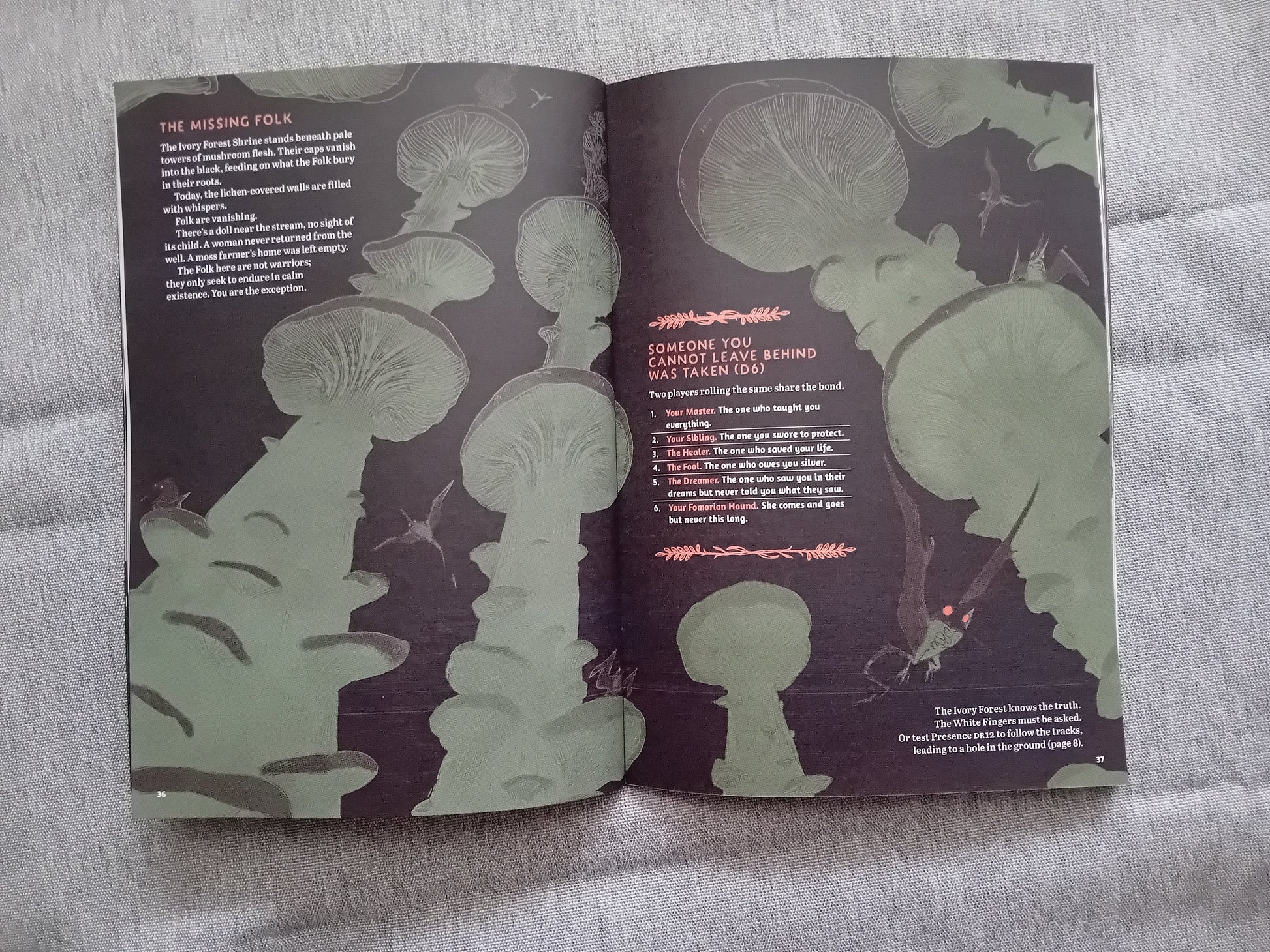 Fomoria uses MÖRK BORG’s rules-light system to support a setting that favors improvisation, fast resolution and the flow of play over mechanical complexity. It also gives more relevance to character development, what ties them to their communities and to each other, and their journey to gain renown.